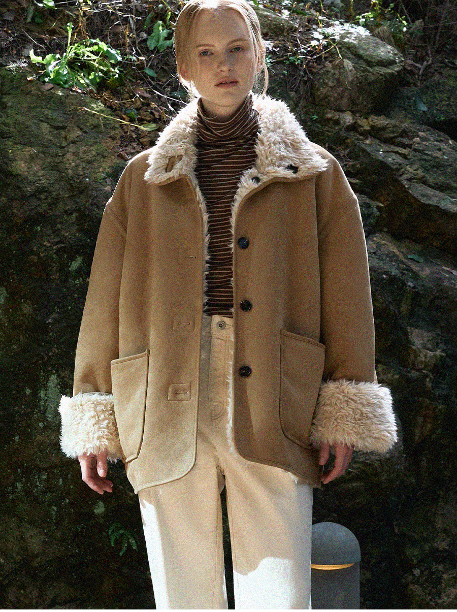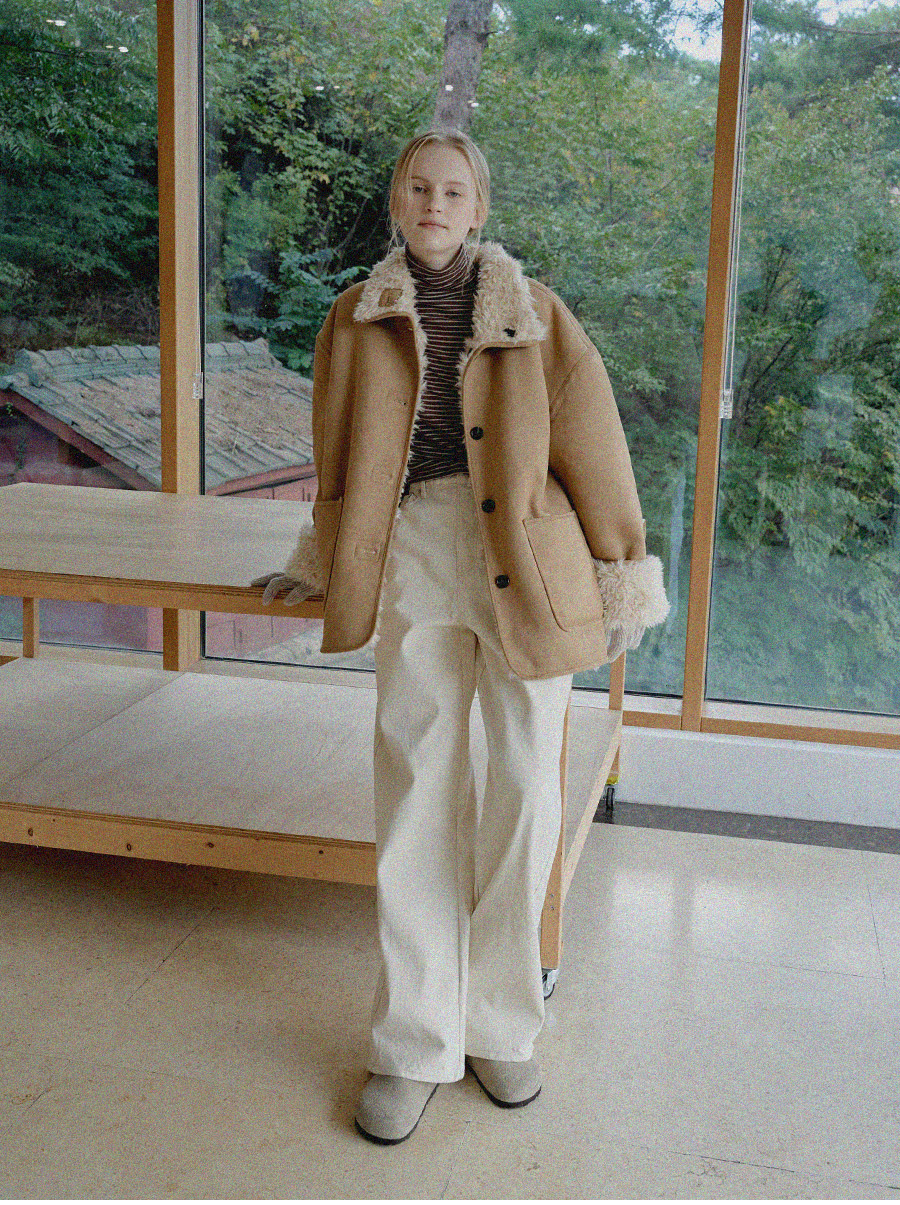 -폴라 안쪽은 컷오프마감 처리 방식으로 원단끝을 접지않고 그대로 컷팅하여 봉제선이 최소화되어 자연스럽고 러프한 분위기를 연출합니다